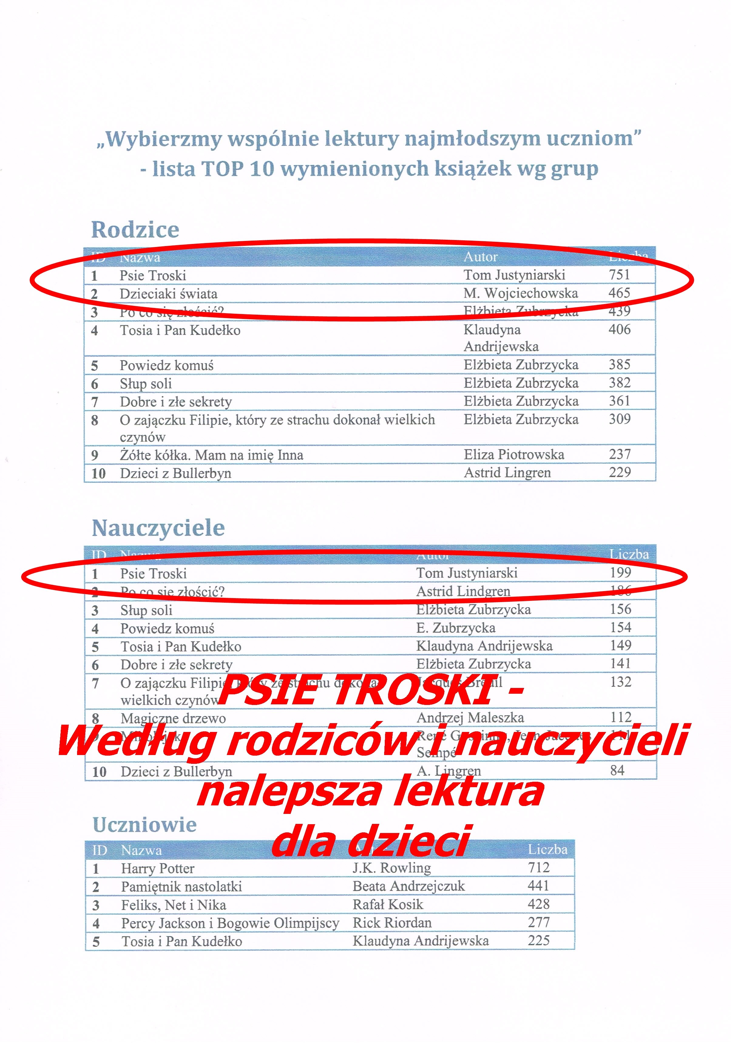 Z radością informujemy, że książka naszego rzecznika prasowego Tomasza Justyniarskiego została lekturą szkolną. Według rodziców i nauczycieli to najlepsza książka ze zgłoszonych do konkursu! Psie Troski uczą empatii, miłości, odpowiedzialności a przede wszystkim tego, że zwierzaki przede wszystkim należy adoptować ze schronisk. A co z tej miłości dziecka i zwierzaka wynikło możecie przeczytać w Psich Troskach!
